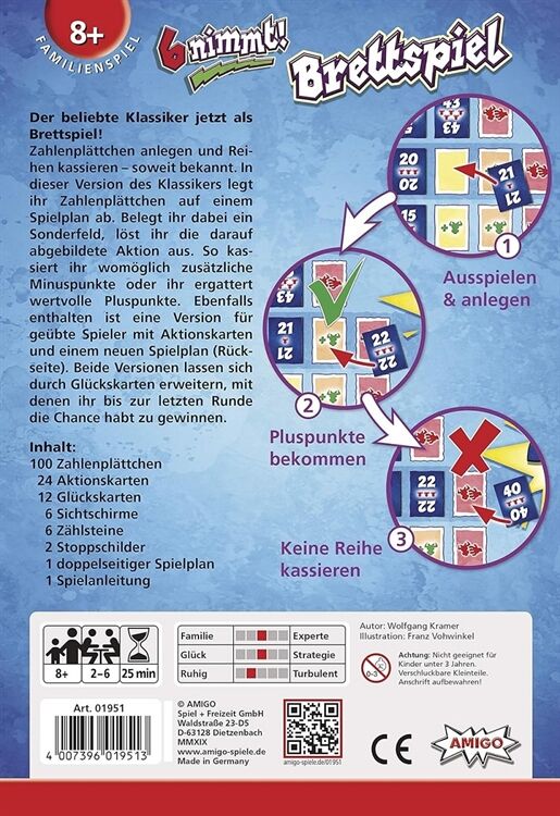 6 nimmt! Brettspiel Der beliebte Klassiker als Brettspiel! Zahlenplättchen anlegen und Reihen kassieren # soweit bekannt, In dieser Version des Klassikers legt ihr Zahlenplättchen auf einem Spielplan ab, Belegt ihr dabei ein Sonderfeld, löst ihr die darauf abgebildete Aktion aus, So kassiert ihr womöglich zusätzliche Minuspunkte oder ihr ergattert wertvolle Pluspunkte, Ebenfalls enthalten ist eine Version für geübte Spieler mit Aktionskarten und einem neuen Spielplan (Rückseite), Beide Versionen lassen sich durch Glückskarten erweitern, mit denen ihr bis zur letzten Runde die Chance habt, zu gewinnen, So spielt man 6 nimmt! Brettspiel: Der Spielplan kommt in die Tischmitte, Die Zahlenplättchen werden gemischt, Auf das jeweils erste Feld der obersten vier Reihen auf dem Spielplan wird offen ein Plättchen gelegt, Von den übrigen Plättchen erhält jeder Spieler zwölf Stück und legt sie offen hinter dem Sichtschirm ab, Das Spiel geht über mehrere Runden, In jeder Runde wählen alle Spieler gleichzeitig ein Plättchen hinter ihrem Sichtschirm aus und legen es verdeckt vor ihren Sichtschirm, Dann werden alle Plättchen aufgedeckt und nach den bekannten 6nimmt!-Regeln an die vier Reihen, in denen Plättchen liegen, angelegt, Legt ein Spieler sein Plättchen dabei auf ein Sonderfeld, erhält er je nach Symbol Plus- bzw, Minuspunkte oder muss die ganze Reihe als Minuspunkte nehmen (letztes Feld einer Reihe), Wer nach 12 Runden die wenigsten Minus- bzw, die meisten Pluspunkte hat, gewinnt, Grundspiel und Profiversion können mit den Glückskarten gespielt werden, Macht ein Spieler Minuspunkte, erhält er Glückskarten, die er einsetzen kann, um aus Minuspunkten Pluspunkte zu machen, Inhalt: 100 Zahlenplättchen 24 Aktionskarten 12 Glückskarten 6 Sichtschirme 6 Zählsteine 2 Stoppschilder 1 doppelter Spielplan 1 Spielanleitung Maße: 27,5 x 19,2 x 6,5 cm Autor: Wolfgang Kramer Grafik: Franz Vohwinkel Erfolgsfaktoren: Das Brettspiel in der beliebten 6 nimmt!-Reihe von Wolfgang Kramer Sonderkarten und Aktionsfelder schaffen mehr Spieltiefe Hohe Abwechslung durch viel Spielmaterial (u,a, doppelseitiger Spielplan und Variantenauswahl)