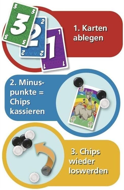 Der Name ist Programm, denn jedes Lama kennt die wichtigste aller Regeln: Lege Alle Minuspunkte Ab! Werdet Karten los, um so möglichst keine Chips zu kassieren. Steigt man aus, oder hofft man eine passende Karte zu ziehen? Entscheidet! Am Ende gewinnt derjenige, der am lässigsten den Minuspunkten ausweichen konnte.