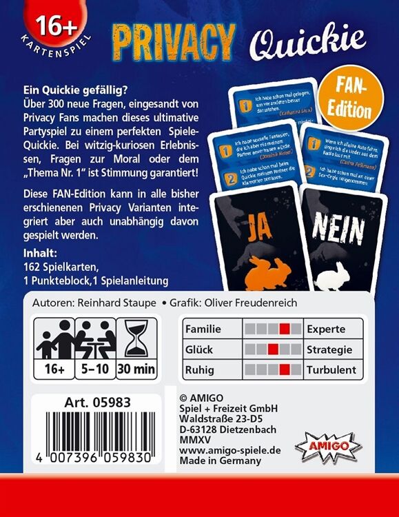 Das Privacy für unterwegs - Passt in die Hosentasche! Komplett neue allgemein gehaltene Frage-Karten die sowohl mit dem Privacy2 Grundspiel, als auch mit Privacy Scharf wie Chili kombinierbar sind. Mit einem attraktiven Preispunkt! Für 5-10 Spieler. Ab 16 Jahren. Spieldauer: ca. 45 Minuten.