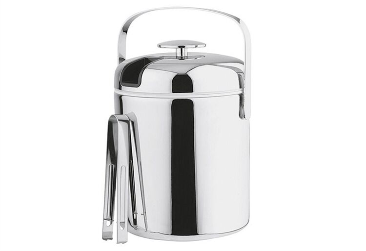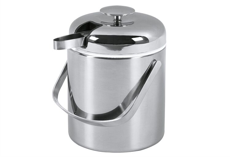 Eiseimer, rund, mit edlem Kunststoffmantel und Tragebügel, hochglanz verchromt, inkl. 18/8 Edelstahl Eiszange. Der speziell isolierte Kunststoffeinsatz sorgt für beste Kühlung