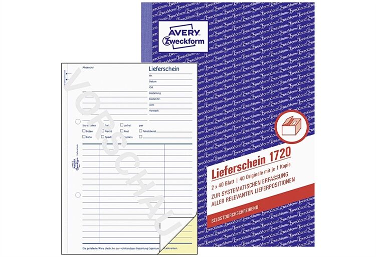 Der Lieferschein 1720 von AVERY ZWECKFORM im DIN A5 Format hilft Ihnen bei der systematischen Erfassung aller relevanten Lieferpositionen. Die Liefer-/ Versandart ist bereits vorgegeben und kann angekreuzt werden. Das Lieferscheinbuch beinhaltet 40 vorgedruckte weiße Lieferscheine mit einem vorgedruckten, selbstdurchschreibenden Duchschlag in gelb. Die Lieferschein Vorlagen und Vordrucke von Avery Zweckform sind zuverlässige, bewährte Hilfen für Ihre Warenwirtschaft, Buchhaltung und Steuer und werden regelmäßig von Rechtsexperten geprüft.