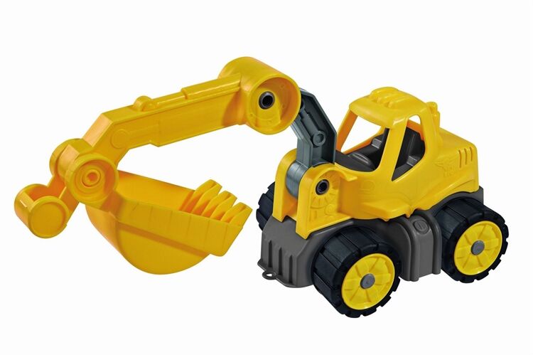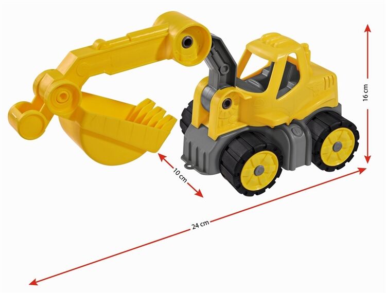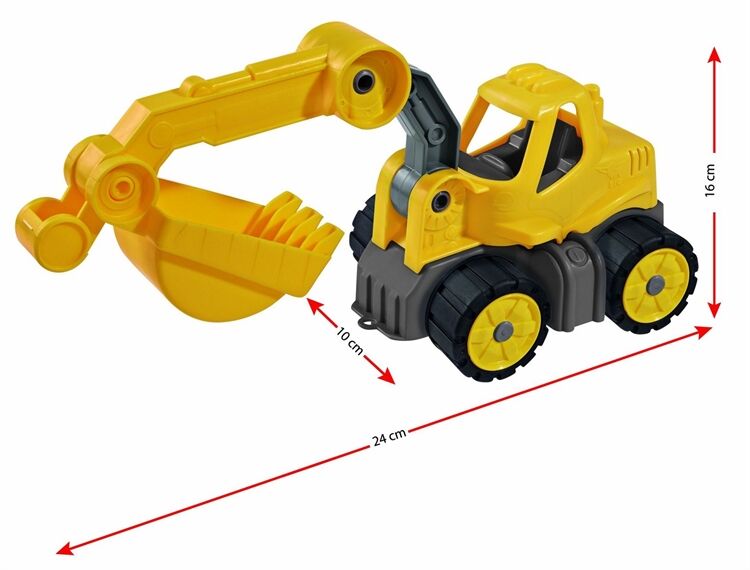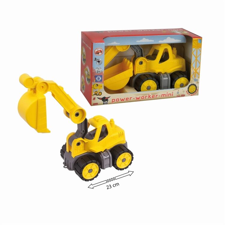 Der BIG-Power-Worker Mini Bagger ist zwar fast um die Hälfte kleiner als sein großes Vorbild, Doch in Sachen Spieleigenschaften steht er diesem in nichts nach, Die Schaufel ist leicht zu bedienen, denn das Design des Baggers ist speziell auf die Ergonomie kleiner Kinderhände abgestimmt, Ein besonderes Extra sind d ie widerstandsfähigen Räder aus weicherem Kunststoff, mit denen alle BIG-Power-Worker serienmäßig ausgestattet sind, Diese lassen sich leicht reinigen und hinterlassen keine Streifen, Damit sind die kleinen Fahrzeuge ideal zum Spielen im Kinderzimmer und im Freien geeignet und das perfekte Spielzeug für Kinder ab 2 Jahren, die gerne buddeln und bauen, Eine tolle Ergänzung zum BIG-Power-Worker Mini Bagger sind die zwei weiteren Kleinfahrzeuge aus der BIG-Power-Worker-Linie: Der BIG-Powe r-Worker Mini Kipper und der BIG-Power-Worker Mini Radlader, Der BIG-Power-Worker Mini Bagger wird von BIG, dem Hersteller des bekannten BIG -Bobby-Car, aus hochwertigen Kunststoffmaterialien in Deutschland gefertigt, Für die hochwertige Verarbeitung und einwandfreie Materialien bürgt die BIG-3-Jahres-Garantie, Informationen zur BIG-Garantie finden Sie unter www,garantie,big,de,