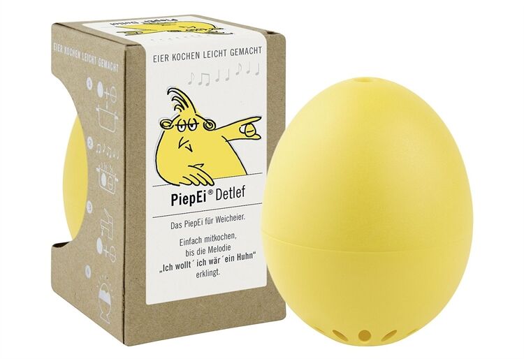 PiepEi: Eier kochen leicht gemacht. Eine [egg]strem gute Geschenkidee. Es sieht aus wie ein Ei, es fühlt wie ein Ei, es kocht wie ein Ei – und es singt: PiepEi®. PiepEi® ist eine präzise Eieruhr, die zusammen mit den Frühstückseiern gekocht wird. Haben Eiweiß und Eigelb die gewünschte Festigkeit erreicht, spielt PiepEi® eine Melodie. Auf die intelligente, wasser- und kochfeste Technik im Innern ist Verlass. So ist der funktionale Spaßmacher das ideale Geschenk für jede Gelegenheit – lustig und mit funktionalem Wert. 'Detlef': für 4 Minuten Weicheier, Material: PC-PES Kunststoff. Spielt eine Melodie für einen Härtegrad: 'Ich wollt' ich wär' ein Huhn' - für weiche Eier = Eiweiß wachsweich, Eigelb flüssig, 1. PiepEi mit Hühnereiern zusammen lagern, 2. PiepEi und Hühnereier zeitgleich in den Kochtopf legen, 3. Zusammen kochen bis die entsprechende Melodie spielt, 4. Eier und PiepEi unter kaltem Wasser abschrecken