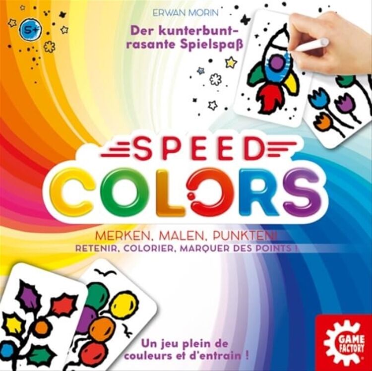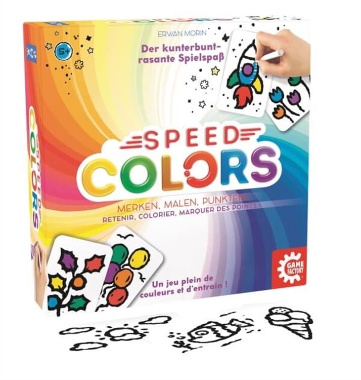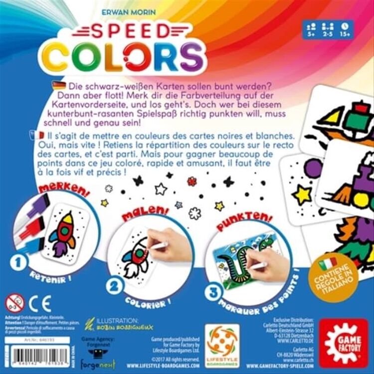 Die schwarz-weißen Karten sollen bunt werden? Dann aber flott! Merk dir die Farbverteilung auf der Kartenvorderseite, und los gehts. Doch wer bei diesem kunterbunt-rasanten Spiel-spaß richtig punkten will, muss schnell und genau sein. Für 2-5 Spieler. Ab 5 Jahren. Spiel-dauer: ca. 15 Minuten.