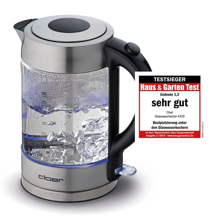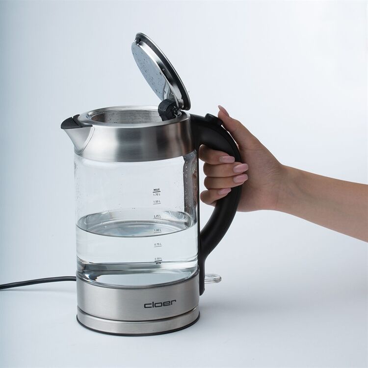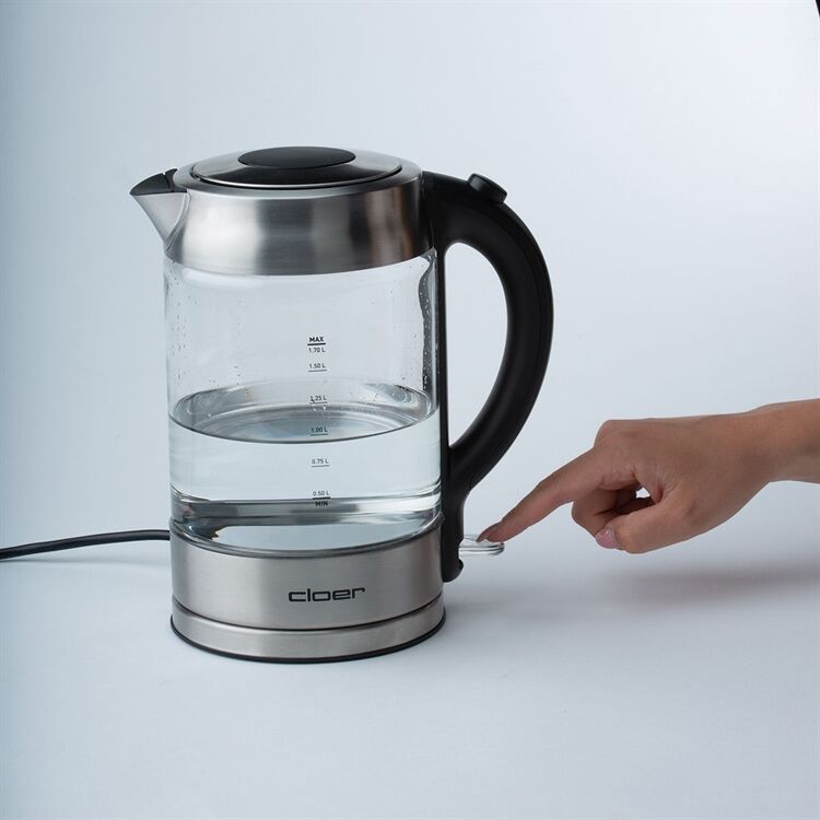 verriegelter Sicherheitsdeckel, praktische Einhandbedienung durch Öffnen des Deckels auf Knopfdruck, Cordless 360° Zentralkontakt, einfaches Aufsetzen und Abnehmen in beliebiger Position, An-/Ausschalter mit Kontrolllampe, LED-Beleuchtung, Sicherheitsausstattung: Überhitzungs- und Trockengehschutz, Ausgussabdeckung aus Silikon, automatisches Abschalten nach Beendigung des Kochvorgangs, verdecktes Heizelement, 1,7 Liter Fassungsvermögen, Glasbehälter mit mattiertem Edelstahl, 1850 - 2200 Watt, 220 - 240 Volt