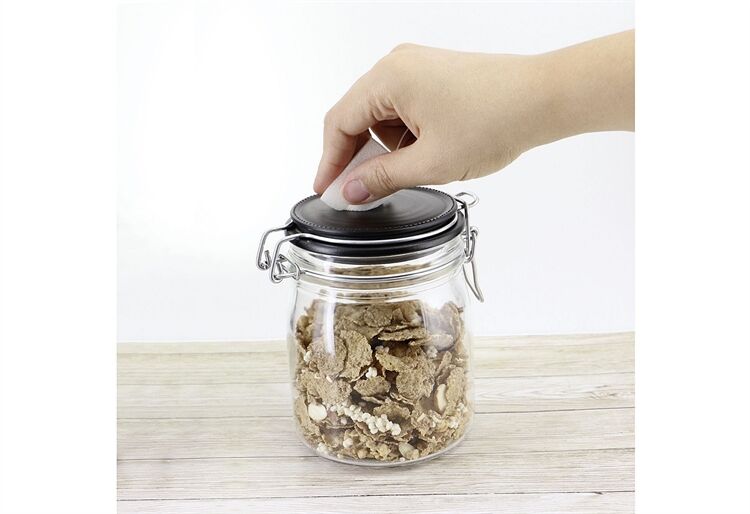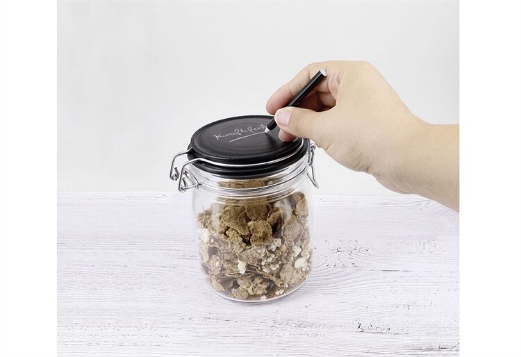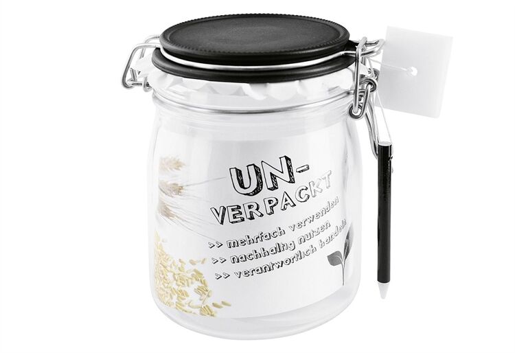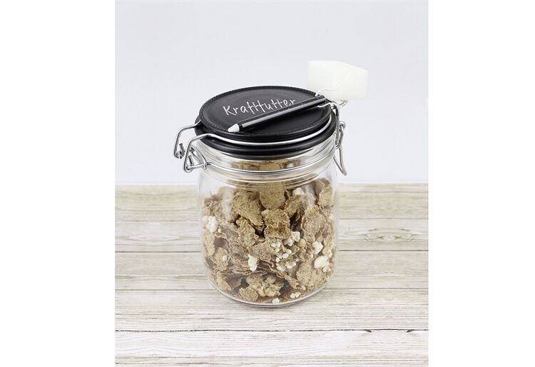 Drahtbügelglas komplett montiert mit Drahtbügel und schwarzem Glasdeckel, Gummiring im Glas liegend, Deckel zum Beschriften mit Kreide oder Griffel geeignet.