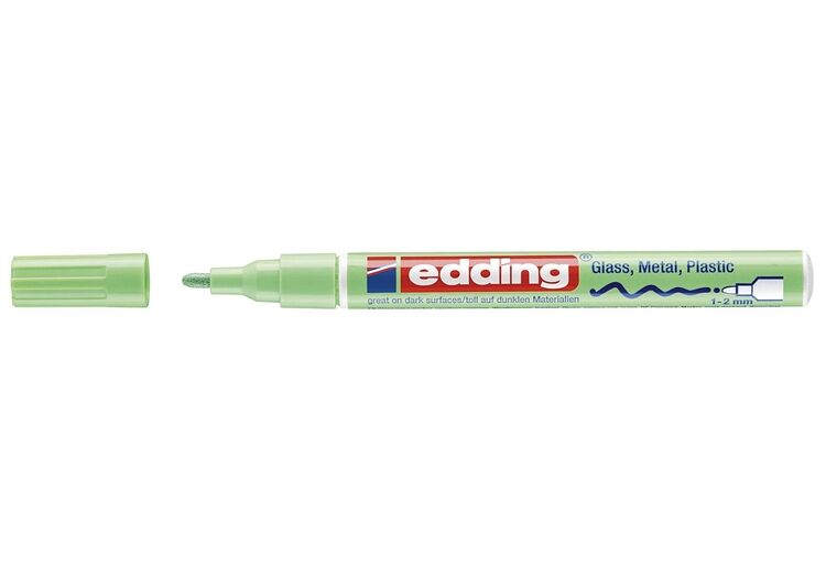 Glanzlack-Marker creative 751. Permanente, geruchsarme, lackartig deckende Tinte ohne Zusatz von Xylol Toluol, wasserfest , Hitzebeständig bis 400°. Rundspitze, Spitze austauschbar . Folienversiegelung. Laufbeschriftung enthält Piktogramme zur Anwendungserklärung für das Aktivieren der Lackmarker. Extrem Lichtbeständig. Stark deckend auch auf dunklen Oberflächen. Haftet auf glatten und porösen Oberflächen.. Schaftmaterial: Aluminium. Schaftfarbe: pastellgrün. Strichstärke: 1 - 2 mm. Schreibfarbe: pastellgrün.
