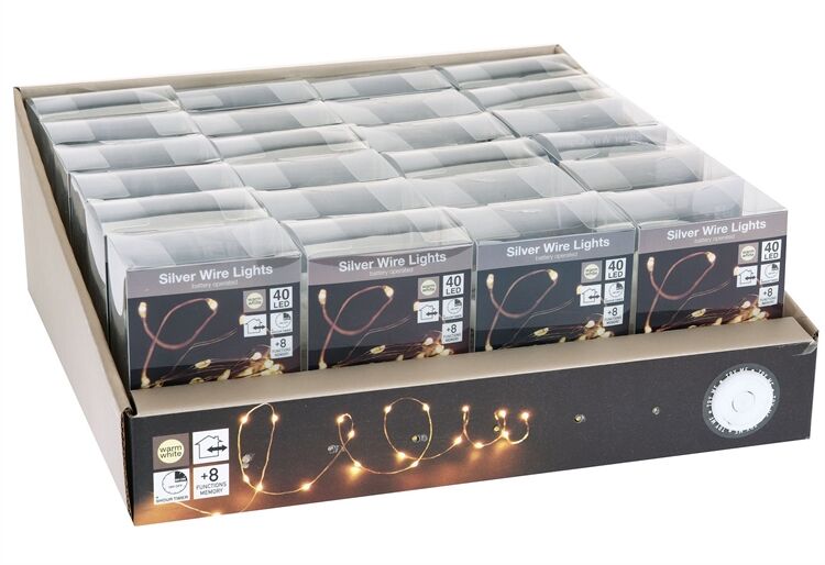 40 LED, warmweiß, mit Timer 8 Funktionen, 210 cm Gesamtlänge, 5 cm Lampenabstand, 10 cm Zuleitungskabel, für 3 x AA Batterien (nicht inklusive), im 24er Display mit Tester