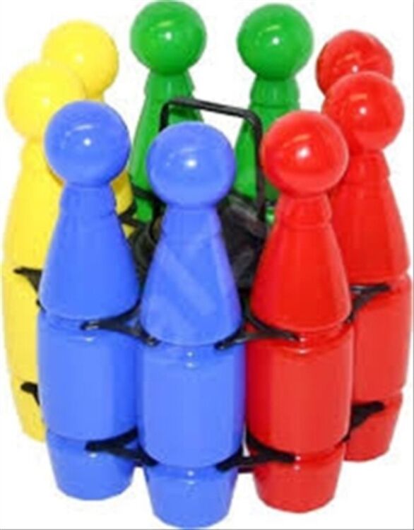 Kegelspiel, wer schafft alle neune? Einfach schön, wenn sich die ganze Familie zum Kegeln trifft! Unsere Kegel haben eine stattliche Höhe und werden mit zwei Kunststoffbällen geliefert, Im praktischen Rondell lässt sich das Kegelspiel bequem zum Spielplatz tragen und anschließend wieder aufräumen, Für draußen und drinnen geeignet, Material: stabiler Kunststoff Kegel Höhe: 29 cm Bälle Maße: 8 cm