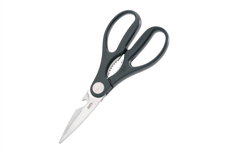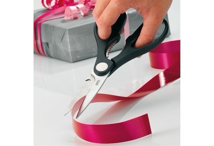 Die Allzweckschere mit Edelstahlklinge eignet sich nicht nur für einen sauberen, exakten Schnitt sondern auch zum Öffnen von Schraubverschlüssen und Kronkorken. Der Kunststoffgriff liegt angenehm in der Hand. Die Schere ist spülmaschinengeeignet.