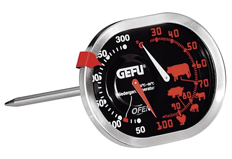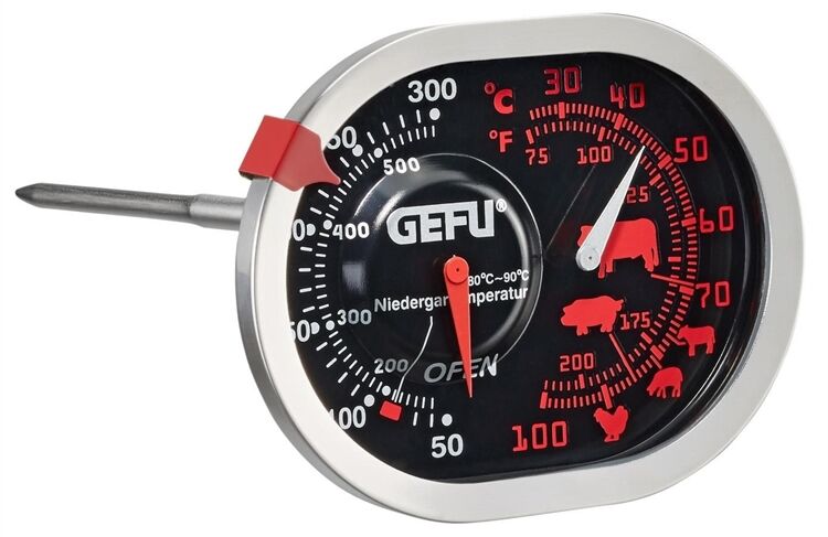 Dieses Braten- und Ofenthermometer ist eine unentbehrliche Hilfe für alle, die köstliche Braten lieben. Es wird einfach in den Bratengespießt gesteckt und misst während des Bratvorgangs gleichzeitig die Temperatur im Inneren des Bratens und außerhalb im Backofen. Auch eine Niedergartemperatur von 70-80°C wird angezeigt, geeignet für die Temperaturmessung im Ofen zwischen 50°-300°C sowie im Fleisch von 30°-100°C.