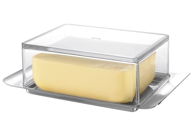 Für 250g Butter, passt ins Seitenfach herkömmlicher Kühlschränke. Mit ergonomische Griffleisten und aus hochwertiger Edelstahl/SAN-Kunststoff in Glasoptik, spülmaschinengeeignet.