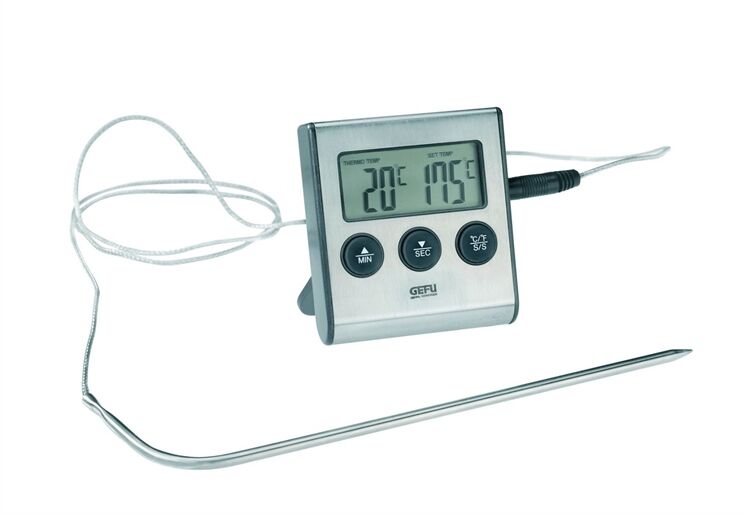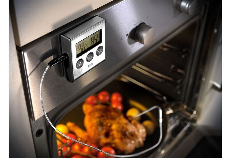 Zu saftigen Braten – außen kross und innen rosig – verhilft das Backofenthermometer TEMPERE. Werden Temperaturvorgaben überschritten, gibt es mit einem Alarmton Bescheid! Einen Messbereich von 0°C bis +250°C, in dem die gewünschte Kerntemperatur des Gargutes einstellbar ist, hat das digitale Backofenthermometer TEMPERE. Die 16cm lange Edelstahl-Sonde wird in den Braten gesteckt und ist durch ein 1m langes, hitzebeständiges Kabel mit dem Thermometer verbunden, das mit seinem Befestigungsmagneten am Herd platziert werden kann. Sobald die vorgegebene Temperatur des Bratgutes erreicht ist, ertönt ein Alarmzeichen – da kann nichts schiefgehen! Als Zusatznutzen bietet das Backofenthermometer noch die Timerfunktion bis 99 Minuten.