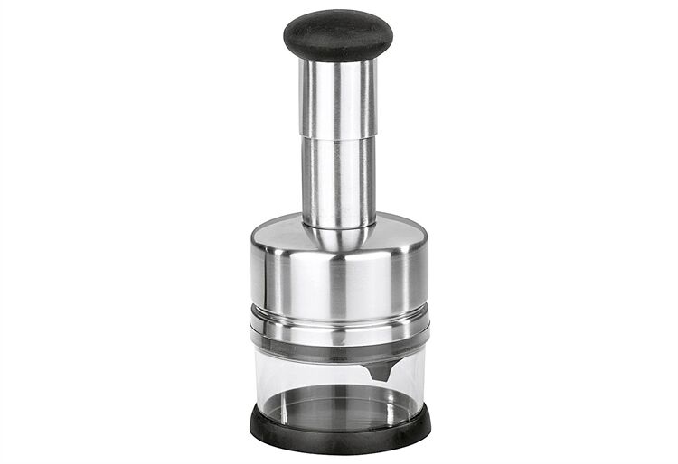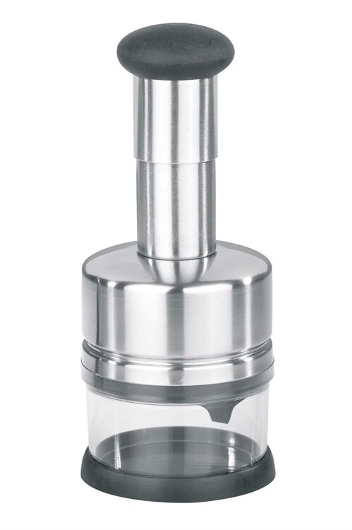 Extra geschärfte Messer für feines Schnittgut, mit seitlichem Abstreifer, rutschfest, mit zusätzlichem Deckel für den Auffangbehälter (Fassungsvermögen: 250 ml), spülmaschinengeeignet.