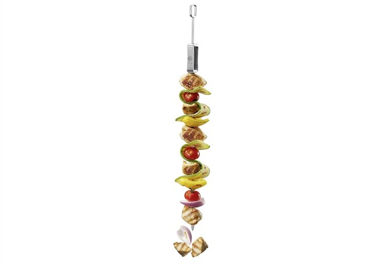 Marinierte Bauchspeckstreifen, Filetstücke oder Gemüsescheiben lassen sich mit den 45 cm langen Grillspießen aus hochwertigem Edelstahl bequem auf dem Grill wenden – und durch den integrierten Abstreifer landet das Grillgut im Nu auf dem Teller, für Gemüse, Garnelen und mehr, spülmaschinengeeignet.