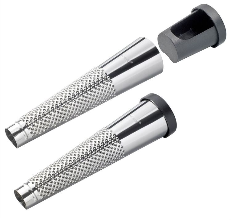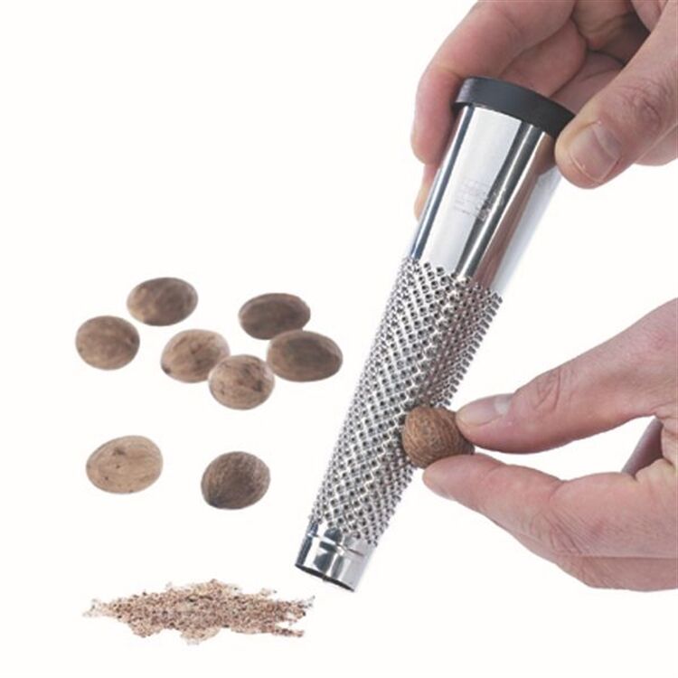 Muskatreibe aus Edelstahl, mit praktischem Nussaufbewahrungs-behälter aus Kunststoff.