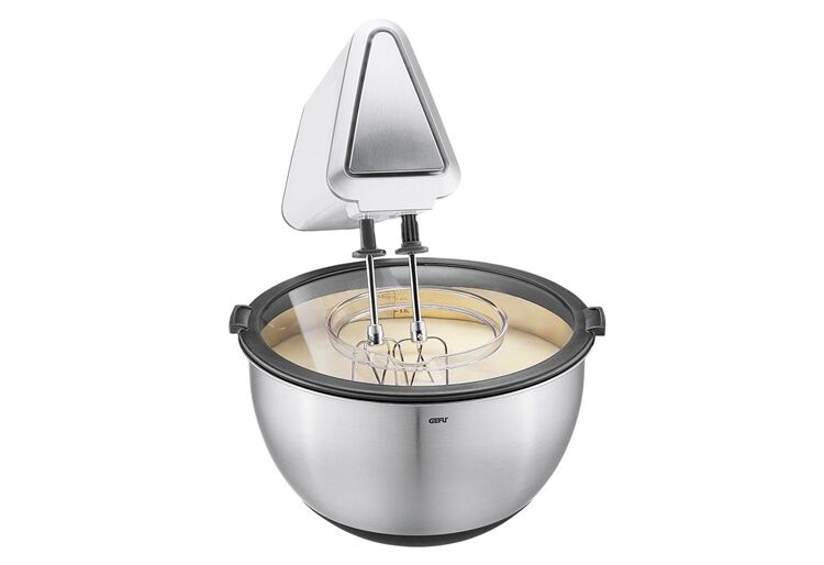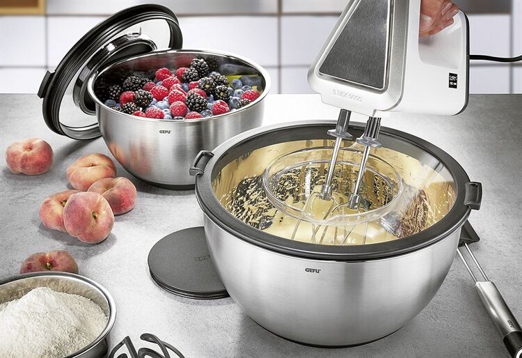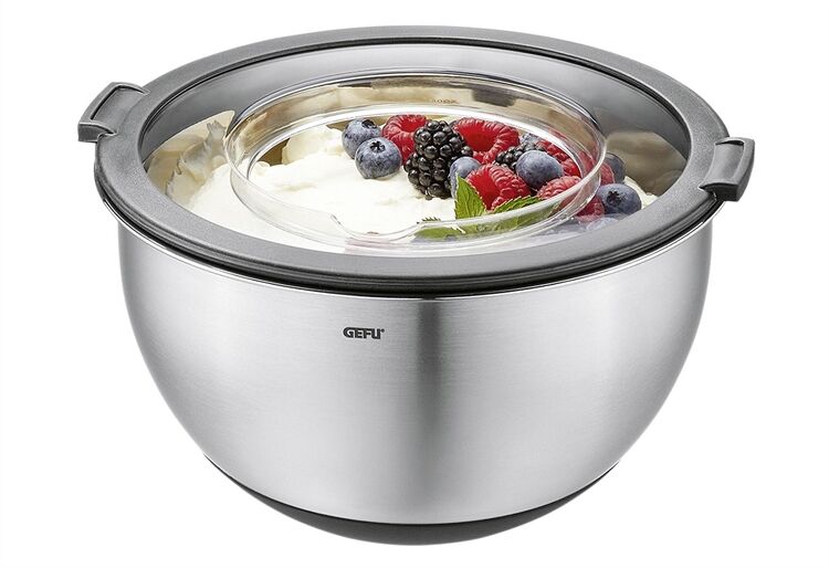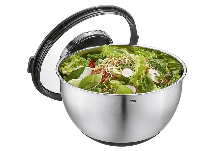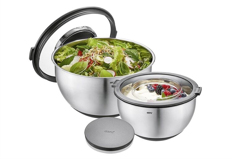 Schüssel-Set mit Spritzschutzdeckel 'Muovo'. Saubere Sache: Diese eleganten Schüsseln aus hochwertigem Edelstahl sind nicht nur besonders vielseitig und rutschfest, sondern verfügen über einen innovativen Spritzschutzdeckel, der lästige Sahne- oder Teigspritzer beim Rühren verhindert und das Rührgut danach wunderbar frisch hält. Produkteigenschaften: rutschfester Stand dank Silikonboden | innenliegende Skalierung: ml / fl.oz | inkl. luftdichtem Aufbewahrungs-und Spritzschutzdeckel mit herausnehmbaren Innenteil | spülmaschinengeeignet. Produktmaße: Inhalt: 1 x Schüssel 2,5 l, Ø 20 cm, H 13,2 cm und 1 x Schüssel 4,5 l, Ø 24 cm, H 15 cm.
