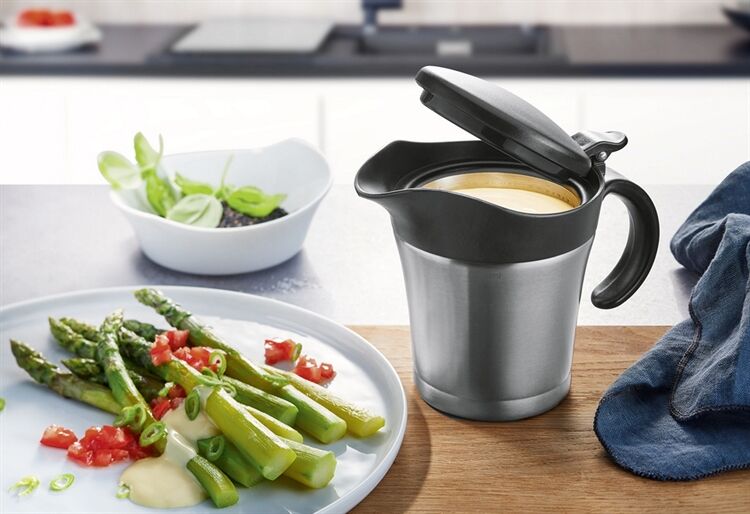 Ob bis zu 500 ml heiße Sauce Hollandaise zum Spargel oder kalte Fruchtsauce für das Dessert: in der doppelwandigen Thermo-Sauciere behält alles seine Genusstemperatur! Der Klappdeckelverschluss wird ganz einfach per Fingerdruck geöffnet.