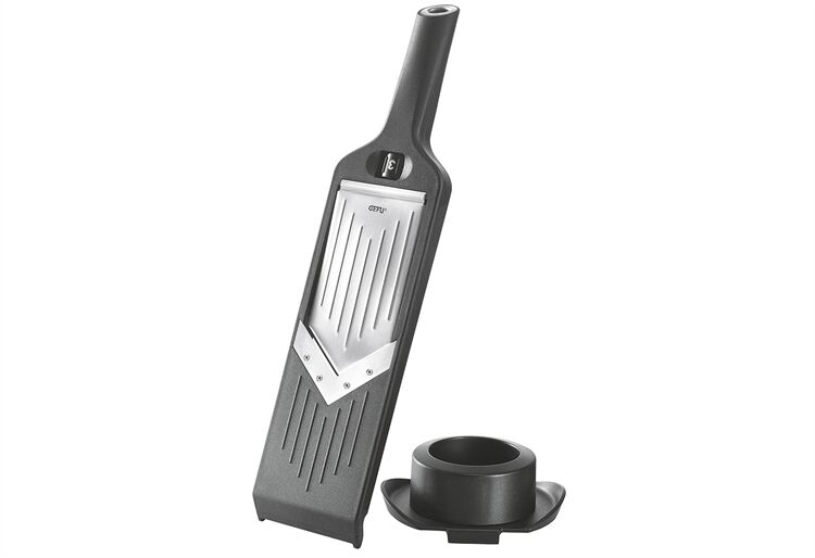 Schick, schwarz, scharf: Der kompakte Gemüse-Hobel VIOLI® mit dem designigen Edelstahlring zum Aufhängen an der Küchenreling sorgt mit der Klinge aus japanischem Klingenstahl im Nu für gleichmäßige Gemüse- oder Obstscheiben. Fünf Schnittstärken von 1 bis 5 mm sind einstellbar – und wird der Hobel nicht benutzt, besteht durch die Sicherheitseinstellung keine Verletzungsgefahr. Rutschfeste Füße geben dem Hobel aus ABS-Kunststoff festen Halt. Und die durchdachten Einkerbungen am spülmaschinengeeigneten Hobel fixieren den Küchenhelfer auf Schüssel- oder Topfrändern.