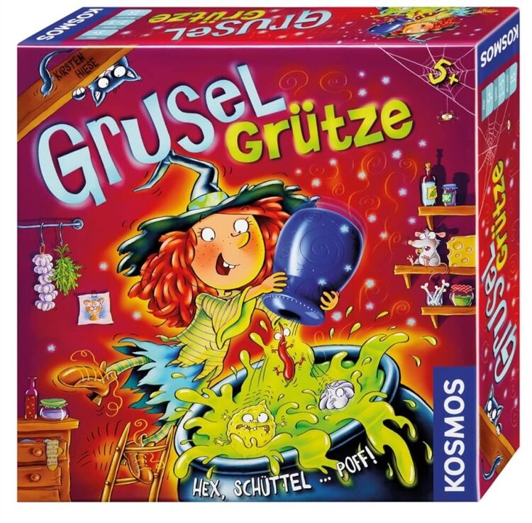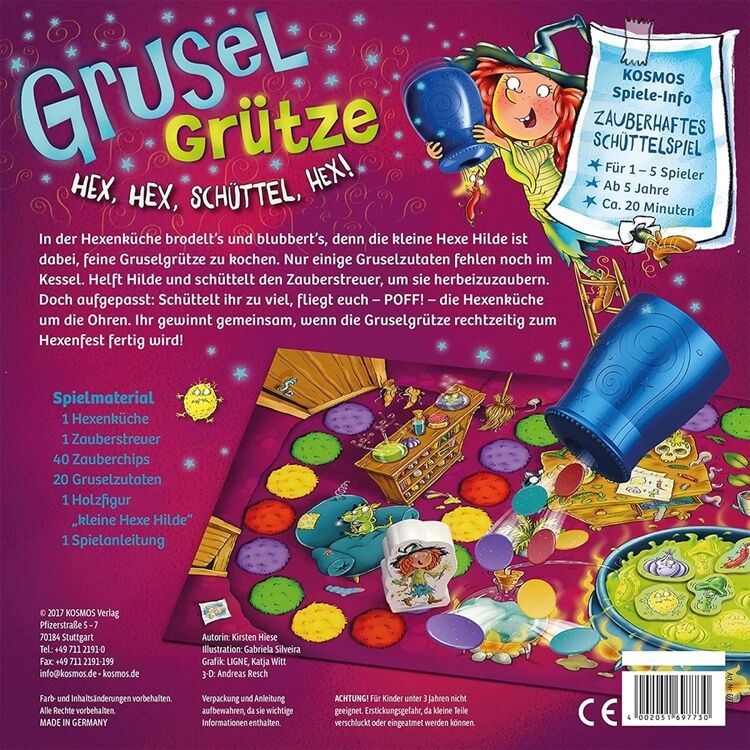 In der Hexenküche geht es drunter und drüber. Die Spieler möchten die Gruselgrütze fertig kochen, bevor die kleine Hexe Hilde wieder am Hexenkessel steht. Sie schütteln reihum den Zauberstreuer und versuchen jeweils drei Chips in der gleichen Farbe herauszuzaubern, die gegen eine magische Zutat eingetauscht werden können. Doch Vorsicht - ein vierter Chip derselben Farbe lässt die magische Mischung explodieren. Die Spieler gewinnen gemeinsam, wenn sie alle Zutaten rechtzeitig herbei gezaubert haben. Für 1-5 Spieler. Ab 5 Jahren. Spieldauer: ca. 15 Minuten.