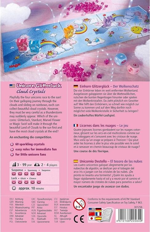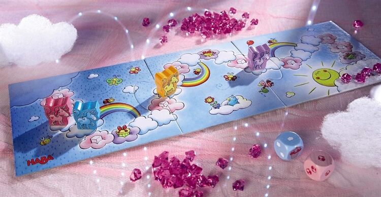 Die vier Einhörner Glitzerglück, Sternenstaub, Wunderblume und Zauberherz leben im weit entfernten Wolkenland. Ausgelassen galoppieren sie über die Wattewölkchen, rutschen die bunten Regenbogen hinunter oder spielen mit den Wolkenkristallen. Da zieht plötzlich ein Gewitter auf! Wer hilft den Einhörnern, so schnell wie möglich zur Sonne zu kommen und auf dem Weg dorthin noch möglichst viele Wolkenkristalle in Sicherheit zu bringen? Ein zauberhaftes Würfel- Laufspiel für 2-4 Spieler. Ab 3 Jahren.