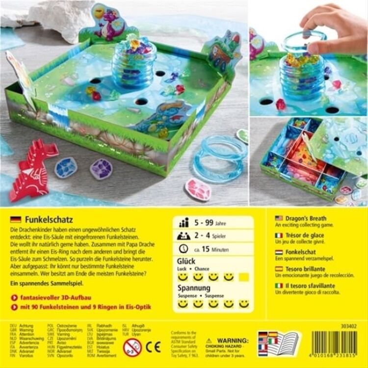 Die Drachenkinder haben einen ungewöhnlichen Schatz entdeckt: eine Eis-Säule mit eingefrorenen Funkelsteinen. Die wollen alle natürlich gerne haben. Zusammen mit Papa Drache entfernen die Spieler einen Eis-Ring nach dem anderen und bringen die Eis-Säule zum Schmelzen. So purzeln die Funkelsteine herunter. Aber aufgepasst: Es können nur bestimmte Funkelsteine eingesammelt werden. Wer besitzt am Ende die meisten Funkelsteine? Ein spannendes Sammelspiel. Für 2-4 Spieler. Ab 5 Jahren. Spieldauer: ca. 15 Minuten.
