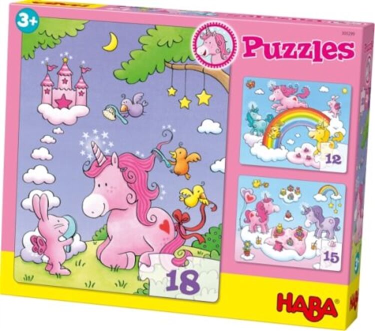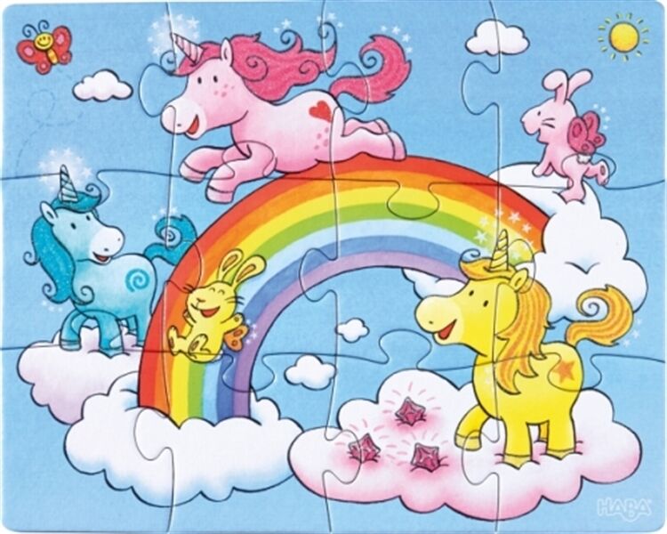 Es gibt Neues aus dem Wolkenland! Die HABA-Puzzles Einhorn Glitzerglück bringen die süßen Einhörner aus dem beliebten und gleichnamigen HABA-Mitbringspiel zurück ins Kinderzimmer, Schon die glitzernde Verpackung lässt Vorfreude aufkommen, Für fabelhaften Puzzle-Spaß sorgen dann drei wunderschön illustrierten Motive, die ebenfalls glitzern, Sie zeigen Glitzerglück beim Galopp über den Regenbogen, beim fröhlichen Picknick in den Wolken und beim abendlichen Plausch mit dem rosa Häschen, Auch mit den Einhornfreunden Sternenstaub, Wunderblume und Zauberherz gibt es ein Wiedersehen, Und dank der unterschiedlichen Anzahl von Teilen reifen Puzzle-Neulinge mit den HABA-Puzzles Einhorn Glitzerglück rasch zu echten Profis heran, Ab 3 Jahren,