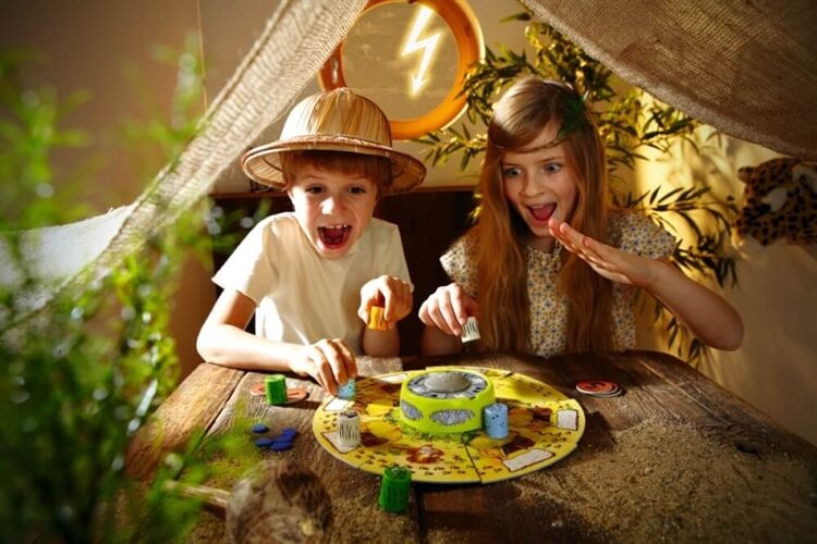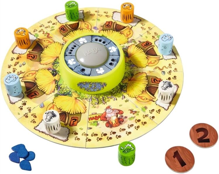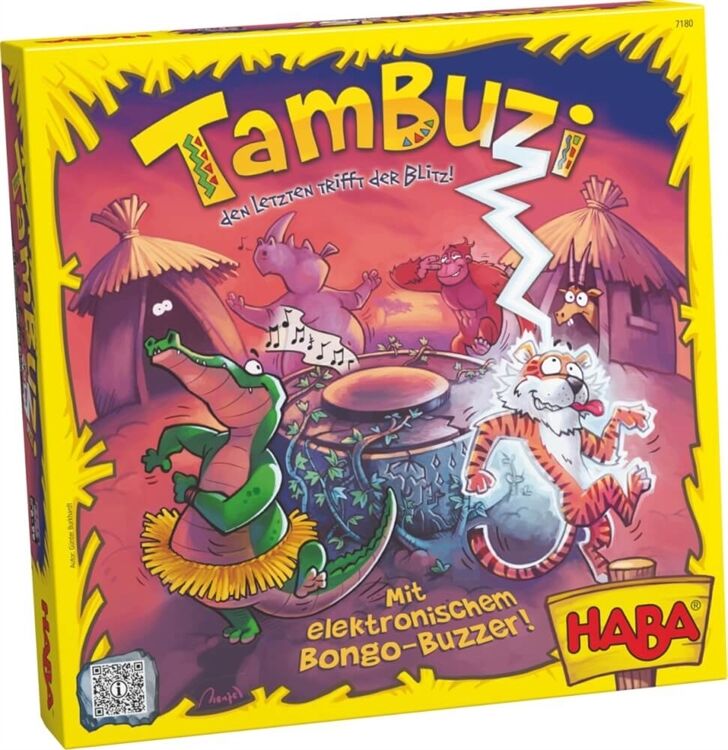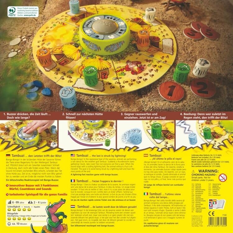 Bongo-Bongo! In der brütenden Hitze der Savanne führen die Tiere einen Regentanz für den Wettergott Tambuzi auf. Plötzlich braut sich ein Gewitter zusammen! Schnell in Deckung, doch nicht alle finden einen Platz. Wenn der Sound mit einem zischenden Blitz erlischt, scheidet das Tier ohne Hütte aus. Ziel ist es, möglichst nicht vom Blitz getroffen zu werden und am Ende die meisten Punkte zu haben. Ein blitzschnelles Reaktionsspiel mit Bongo-Buzzer. Für 2-4 Spieler. Ab 6 Jahren.