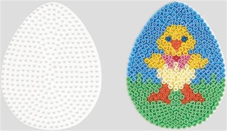 Das Spielen mit den Perlen fördert Kreativität, Farbempfinden und Koordination von Augen und Hand, HAMA, Marktführer im Bereich Bügelperlen überzeugt durch eine hohe Produktqualität, ein umfangreiches Programm in vielen Preislagen und interessante Neuheiten in jedem Jahr, Grundlage für jedes Perlenmotiv ist eine Stiftplatte, die es in vielen verschiedenen Formen und Größen gibt, Diese Platte gibt das Motiv Ei vor, Ab 5 Jahren,