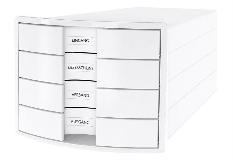 Schubladenbox 'Impuls' mit neuem, modernen Gehäusedesign mit 4 geschlossenen, großzügigen Schubladen für Papierformate DIN A4/C4. Innovatives, attraktives Design in höchster Qualität. Inklusiver großer auswechselbarer Beschriftungsschilder mit hochwertiger Klarsichtabdeckung für ein einfaches Auffinden von Unterlagen. Leichtlaufende Schubladen mit Auszugssperre und durchgängig geschlossenem Boden auch zur Kleinteile Organisation geeignet. Extra stabile Gehäuseausführung mit optimierter Stapeltechnik. Rutschfeste, möbelschonende Gummifüße sorgen für einen sicheren Stand. Made in Germany. Außenmaße (B x T x H): 280 x 367 x 235 mm. Innenmaße der Schubladen (B x T x H): 240 x 325 x 37 mm, daher ein hohes Fassungsvolumen. Hochwertiger Kunststoff, Polystyrol (PS). Farbe weiß.