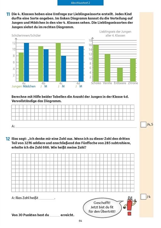 Fit zum Übertritt? Diese Frage stellen sich viele Schülerinnen und Schüler in der 4. Klasse. Der Druck ist in dieser Jahrgangsstufe oft hoch. Alle anstehenden Tests lassen schnell die Anspannung steigen. Dieses Heft soll den Kindern im Fach Mathematik die Möglichkeit bieten, Inhalte zu vertiefen, Wissenslücken zu schließen, Aufgaben zu trainieren und sich selbst zu prüfen. Es deckt alle lehrplanrelevanten Themen ab: Zahlenraum bis eine Million, Grundrechenarten, Textaufgaben, Größen, Geometrie und Kombinatorik. Jeder Themenbereich ist in drei Teile gegliedert: ein Merkkasten mit den wichtigsten Infos, ein Übungsteil mit vielseitigen Aufgaben und ein Test. Am Ende stehen zwei zusammenfassende Abschlusstests. Ausführliche und schülergerechte Lösungswege machen es möglich, dass die Kinder ihre Fehler nachvollziehen können.
