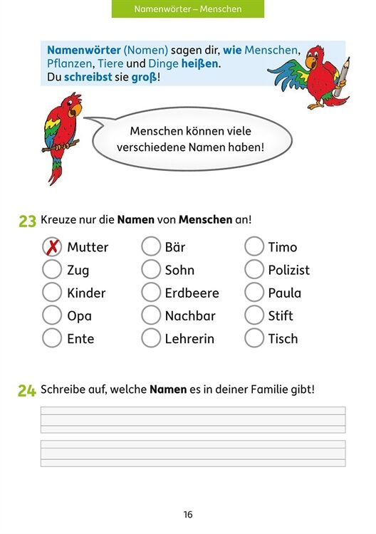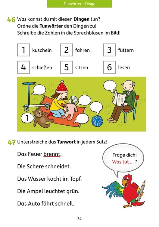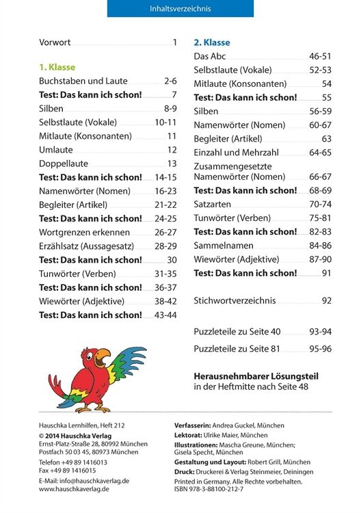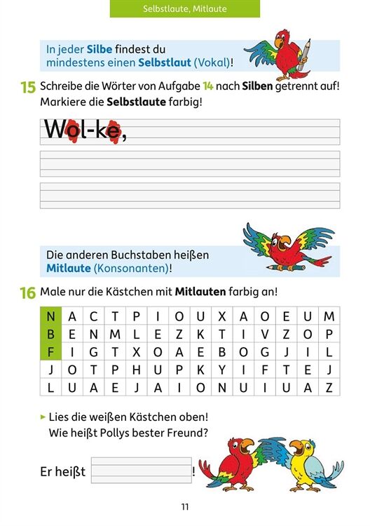 Der bunte Papagei Polly unterstützt die Kinder beim Erlernen der Grundstrukturen der deutschen Sprache. Mit abwechslungsreichen und spielerischen Übungen werden zu Beginn die Grundbegriffe Laut, Buchstabe und Silbe eingeübt. Weiter geht es mit der Unterscheidung der Wortarten Namenwort, Tunwort und Wiewort. Auch die Struktur und der Aufbau von Sätzen werden angebahnt. Mit viel Spaß vermittelt diese Lernhilfe den Kindern so ein Bewusstsein für den Aufbau der deutschen Sprache und bereitet sie ideal auf den Grammatikunterricht der 3. und 4. Klasse vor.