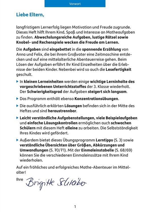 Die Kinder begeben sich mit Anna und Felix auf eine spannende Zeitreise ins Mittelalter. Wie Detektive arbeiten sie sich von Aufgabe zu Aufgabe und geraten so immer tiefer ins Abenteuer. In vielen abwechslungsreichen Aufgaben, Rätseln und Rechenspielen, die alle in die Erzählung rund um die Zeitreise eingebettet sind, werden die vier Grundrechenarten, Größen, Maße, Gewichte und Zeitangaben geübt. Die leicht verständlichen Aufgabenstellungen, viele Beispielaufgaben und einfache Kontrollen durch den herausnehmbaren Lösungsteil fördern die Selbstständigkeit der Kinder. Mit diesem Heft können die Kinder ohne Leistungsdruck den Mathestoff der 3. Grundschulklasse festigen und entwickeln so Freude am Rechnen!