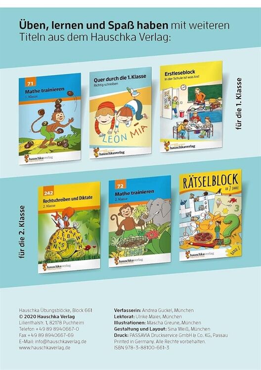 Mit viel Spaß und Freude können die Kinder in diesem Block den Stoff der 1. Klasse in Mathe und Deutsch üben und wiederholen. Die vielen abwechslungsreichen und spielerischen Aufgaben sowie die farbigen Illustrationen motivieren die Kinder zum Lernen. Darüber hinaus gibt es auch ein paar knifflige Aufgaben, die über die reine Wissenswiedergabe hinausgehen und die Kinder so zum eigenständigen Denken anregen. Ein praktischer Übungsblock für zuhause und unterwegs mit dem das Lernen einfach Spaß macht!