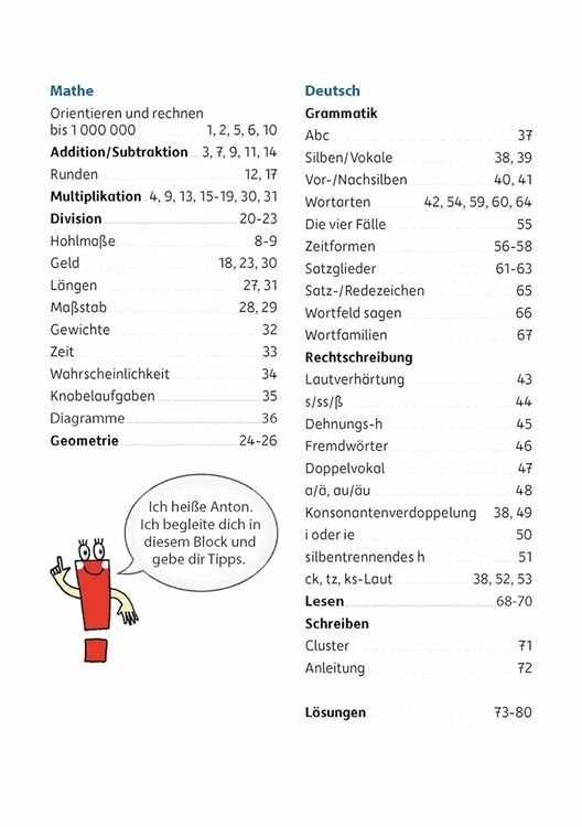 In diesem Block können die Kinder anhand von abwechslungsreichen und kindgerechten Aufgaben den Stoff der 4. Klasse in Mathe und Deutsch üben und wiederholen. Einige knifflige Aufgaben, die über die reine Wissenswiedergabe hinausgehen, regen die Kinder zum eigenständigen Denken an. Alle Aufgaben sind liebevoll illustriert. Ein praktischer Übungsblock für zuhause und unterwegs mit dem das Lernen einfach Spaß macht!