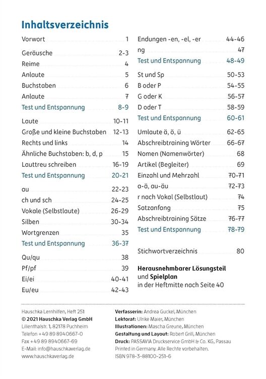 Das lustige Eichhörnchen Molli hilft den Kindern, das richtige Schreiben zu üben. Das Heft beginnt mit Übungen zu Lauten, Selbstlauten und Silben, danach folgen bestimmte rechtschriftliche Schwierigkeiten wie Qu/qu, St/st u. ä. Dabei ist das ganze Heft sehr kindgerecht aufgebaut und mit vielen farbigen Zeichnungen versehen. Nach jedem Abschnitt können die Kinder auf einer Seite das Gelernte anwenden und so prüfen, ob sie das jeweilige Lernziel erreicht haben. Danach folgt als Belohnung eine Entspannungsseite mit kleinen Rätseln oder Malaufgaben. Der herausnehmbare Lösungsteil unterstützt die Kinder bei ihrer selbstständigen Arbeit.