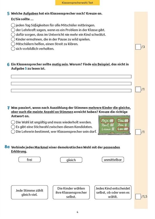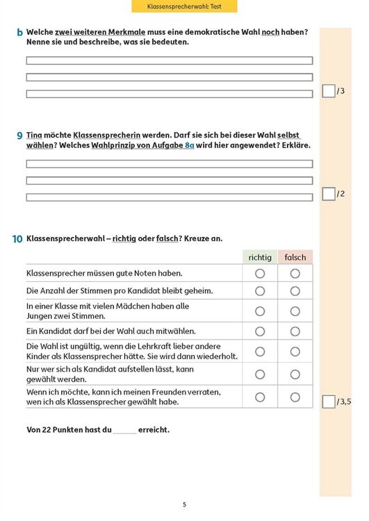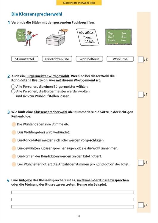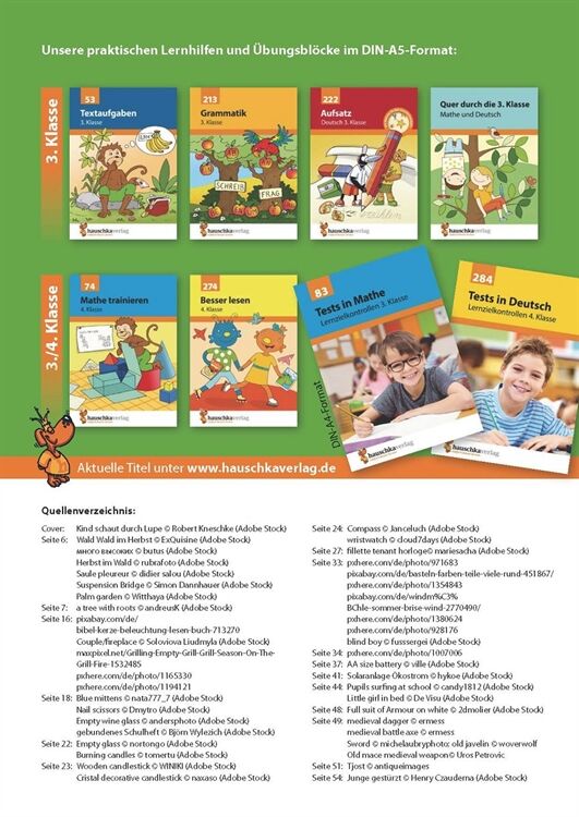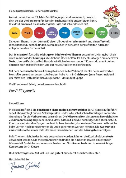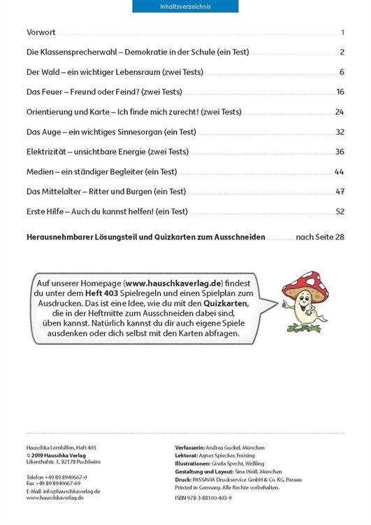 Neben Deutsch und Mathematik ist der Sachunterricht in der Grundschule ein wichtiges Fach. Es kann und sollte gut vorbereitet werden. Gerade in diesem Fach wird auch meist Fleiß mit guten Noten belohnt. Mit diesem Testheft können sich die Kinder gut auf einen anstehenden Test vorbereiten und sich selbst kontrollieren, ob oder bei welchen Fragen sie noch Schwierigkeiten haben. Das Heft deckt viele Bereiche der Lehrpläne ab: Klassensprecherwahl, unsere Augen, Orientierung mit Kompass und Karte, Feuer und Feuerwehr, Medien und Werbung, Strom, Mittelalter mit Rittern und Burgen, Erste Hilfe und Wald mit seinen Pflanzen und Bewohnern. Zu jedem Thema gibt es eine Infoübersicht, die die wichtigsten Inhalte zusammenfasst. Die Fragen in den Tests prüfen reines Lernwissen, aber auch komplexeres Transferverstehen. Am Ende können die Ergebnisse mit dem Lösungsteil verglichen, Punkte und eine Note vergeben werden.