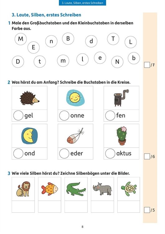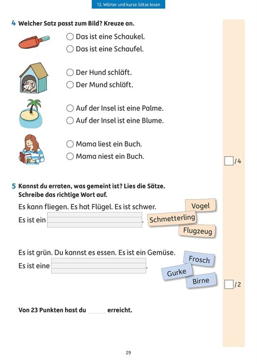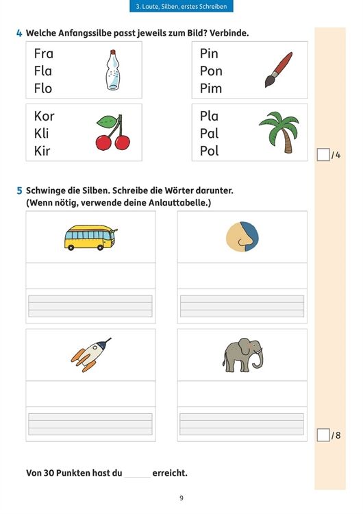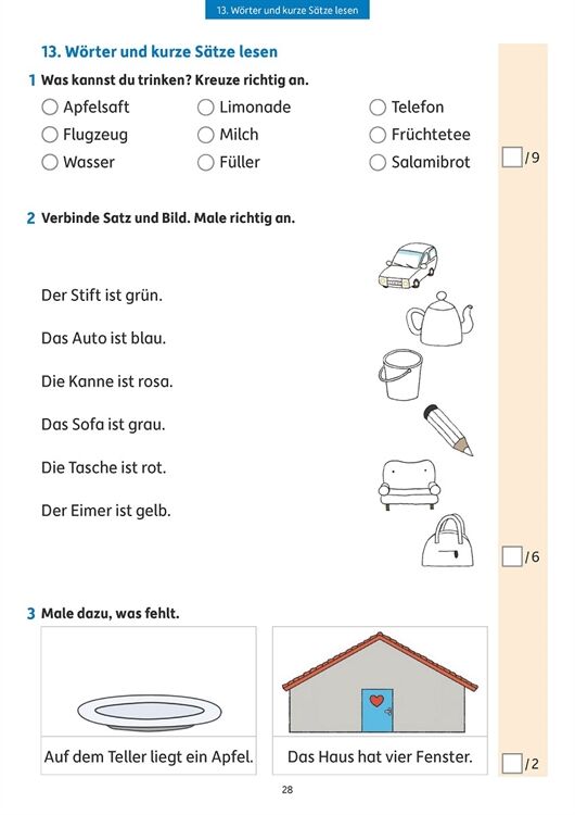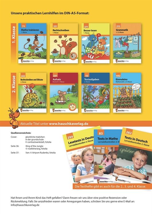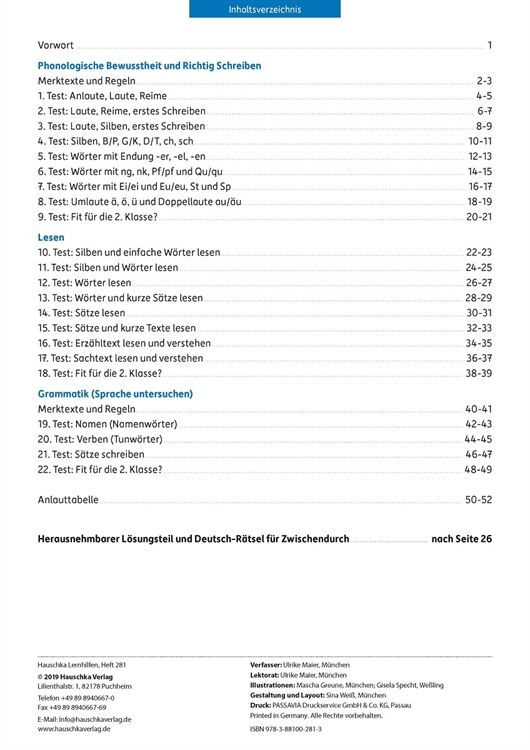Bereits in der 1. Klasse gehören Tests zur Schule dazu, um den Lernstand der Kinder abzufragen. Für die meisten Kinder ist das eine aufregende Sache und es kommt die Frage auf: Habe ich wirklich alles verstanden? Mit diesem Heft können Eltern und Kinder zu Hause in entspannter Atmosphäre den Wissensstand überprüfen und die Kinder so auch für die Anforderungen in der Schule stärken. Das Heft beinhaltet verschiedene Tests zu den Bereichen Phonologische Bewusstheit, Schreiben, Lesen und Grammatik. Mit Hilfe des Lösungsteils können die Ergebnisse verglichen und Punkte vergeben werden. So bekommen Eltern und Kinder eine Rückmeldung, was das Kind schon kann und in welchen Bereichen noch geübt werden muss.