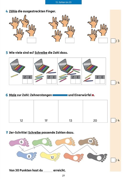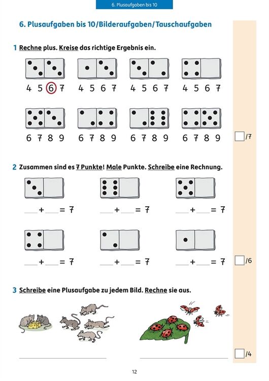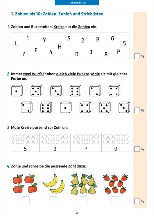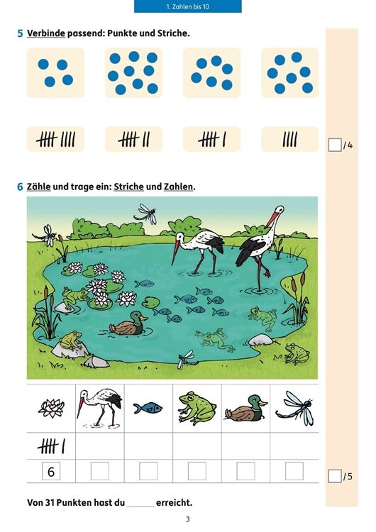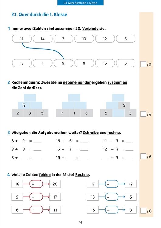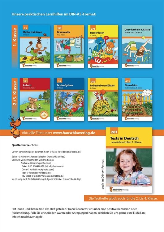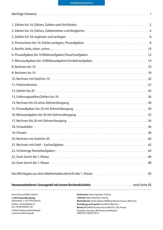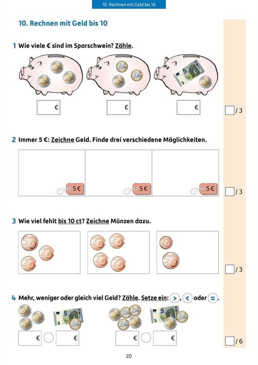 Auch die jungen Abc-Schützen werden in der Schule schon durch kurze Tests herausgefordert. So kommen die Fragen auf: Kann ich das? Habe ich alles verstanden? Ist doch noch etwas unklar? In diesem Heft können sie zeigen, was sie gelernt haben. Übungstest in stressfreier Umgebung zu Hause bieten die Möglichkeit, sich auf Tests in der Schule vorzubereiten. Vielseitige Aufgaben zu allen Bereichen des Mathematikunterrichts werden hier geboten. So gibt es Tests zu folgenden Themen: Zahlenraum bis 10 bzw. bis 20, Addition und Subtraktion auch mit anschaulichen Illustrationen, Rechnen mit Geld, das Lesen der Uhr, einfaches Rechnen mit Zeitpunkten und Zeitspannen, geometrische Grundbegriffe, Zahlenrätsel und Sachaufgaben. Mit Hilfe des Lösungsteils können die Ergebnisse verbessert und bewertet werden. Die Kinder und Sie als Eltern können so gut einschätzen, was die Kinder schon sicher beherrschen oder in welchen Bereichen sie für den Test in der Schule noch üben sollten.