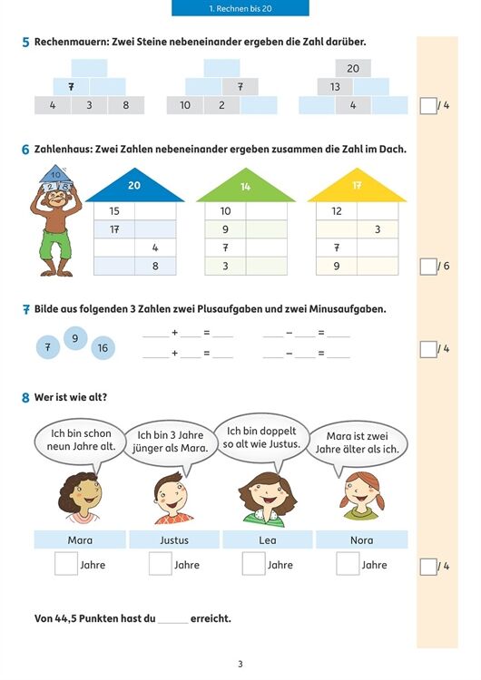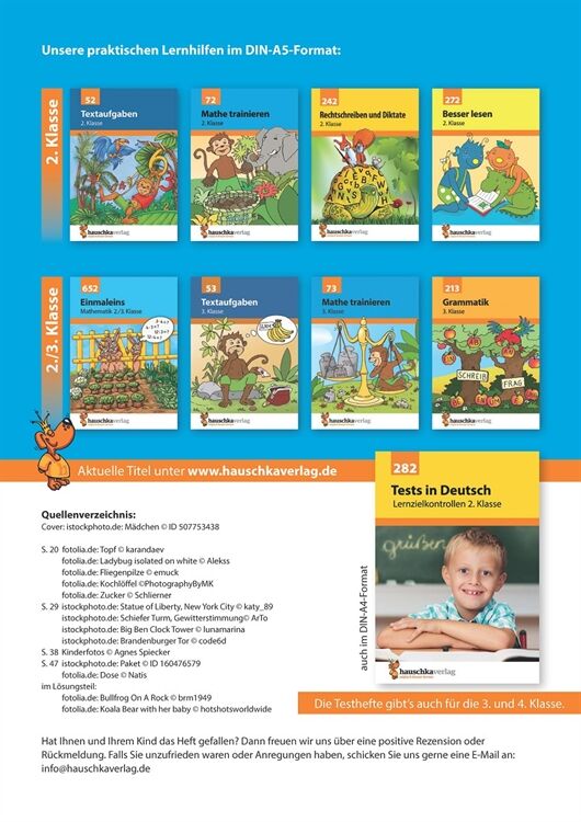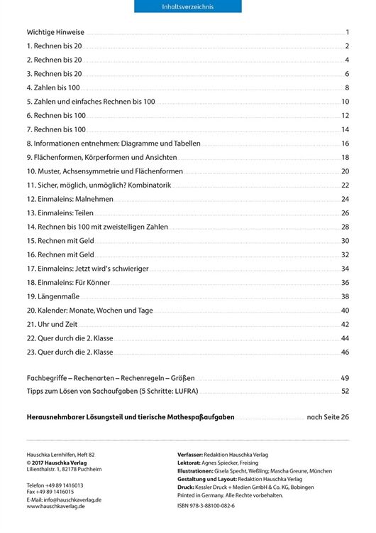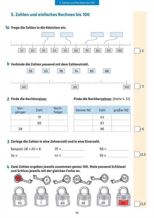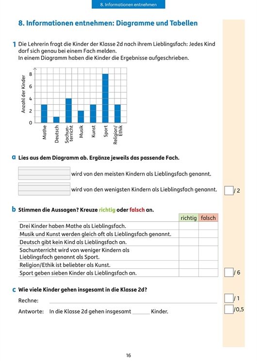 Tests begleiten den Schulalltag der Kinder: Hier können sie zeigen, was sie gelernt haben. Um sich darauf vorzubereiten, ist es eine gute Hilfe, einen Übungstest vorher zu Hause auszuprobieren. Mit diesem Heft werden alle Themen des Mathelehrplans abgedeckt und die Tests einzelnen Lernbereichen zugeordnet, sodass sich leicht ein passender Übungstest finden lässt. Die Aufgaben sind abwechslungsreich und kindgemäß. Sie stärken Rechenfertigkeiten im Zahlenraum bis 100, üben Text- und Sachaufgaben, trainieren den Umgang mit Größen (Geld, Längen und Zeiten) und behandeln Fragen zu Flächen- und Körperformen, Wahrscheinlichkeit und Kombinatorik. Mit Hilfe des Lösungsteils können die Ergebnisse verbessert und bewertet werden. Eine Note lässt sich berechnen. Die Kinder können so gut einschätzen, was sie schon sicher beherrschen oder in welchen Bereichen sie für die Klassenarbeit in der Schule noch üben sollten.
