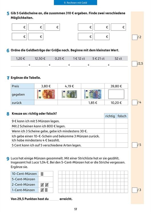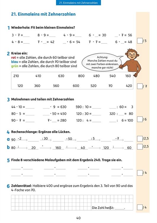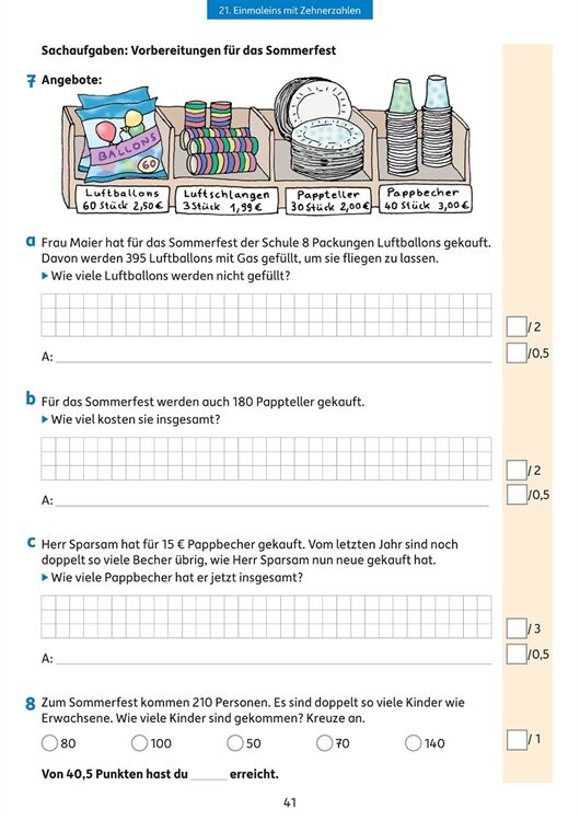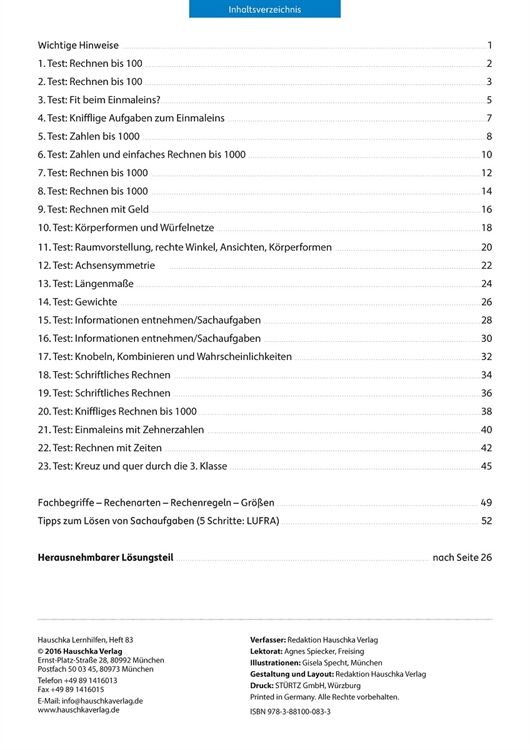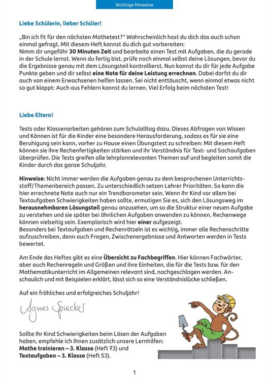 Keine Angst vor Klassenarbeiten! Mit diesem Heft können alle Mathetests gut vorbereitet werden. In den Übungstests, die nah an realistische Klassenarbeiten angelehnt sind, können die Schüler ihr Wissen überprüfen und sich anhand einer Punkteskala selbst bewerten. Die Inhalte richten sich nach Lehrplänen und Bildungsstandards und schließen alle Kompetenzbereiche der dritten Klasse ein: Grundrechenarten, Zahlenraumerweiterung bis 1 000, Sachaufgaben zu Längen, Gewichten und Zeiten, Geometrie, Zufall/Wahrscheinlichkeit/Kombinatorik. Ausführliche und schülergerechte Lösungswege machen es möglich, dass die Kinder ihre Fehler nachvollziehen können. In einer Übersicht am Ende des Heftes werden wichtige Regeln und Fachbegriffe zusammengefasst.