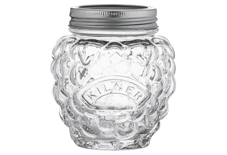 Hochwertiges Einmachglas mit Schraubverschluss in Beeren-Form. Material: Glas / Metall. Maße: Ø 10 cm, 400 ml, H 11,5 cm.