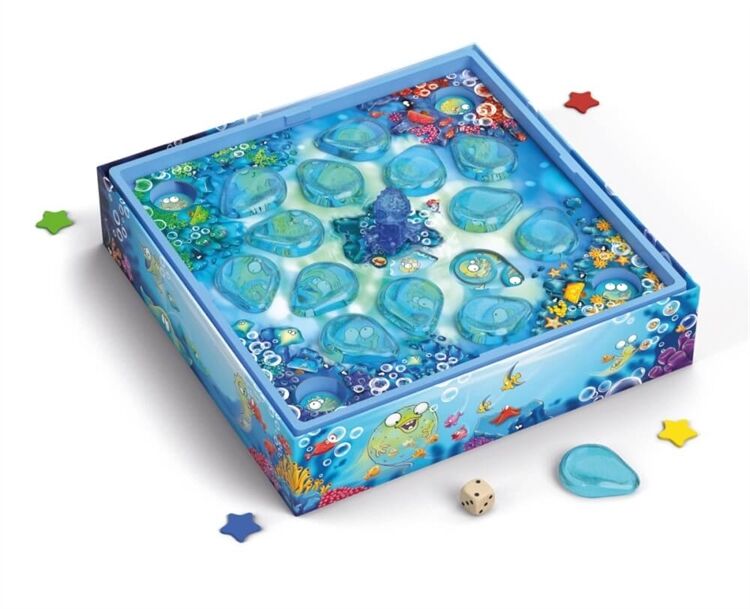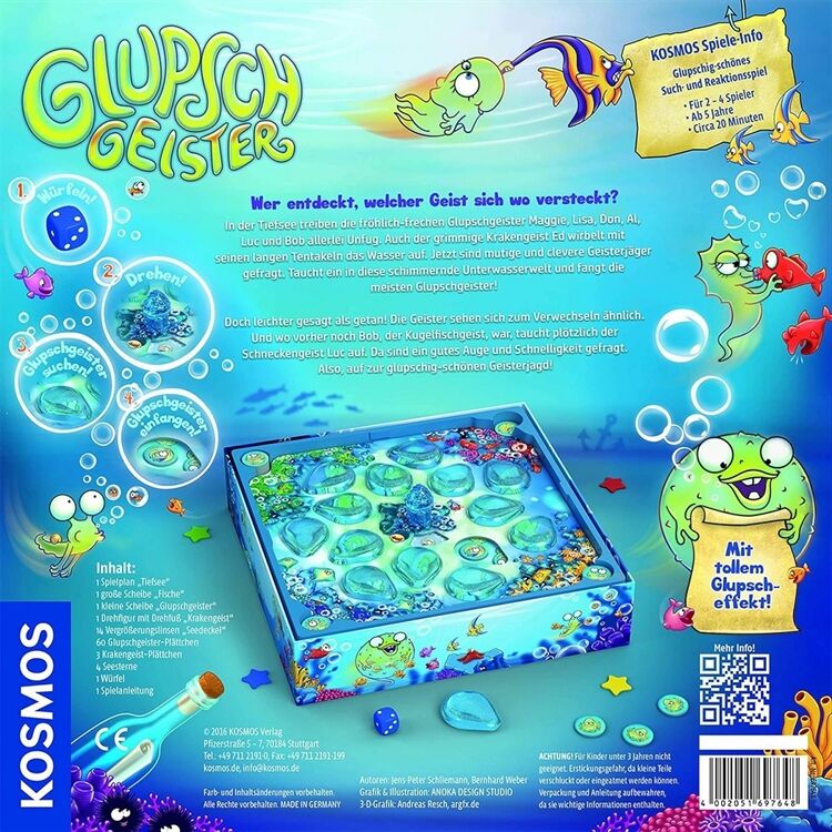 Der jüngste Spieler würfelt und dreht den Krakengeist um die gewürfelte Anzahl an Feldern weiter. Der Krakengeist zeigt nun an, welcher Glupschgeister-Freund jetzt von allen Spielern gleichzeitig unter den Seedeckeln gesucht wird. Schnell legen die Spieler ihren Seh-Stern auf den Deckel unter dem sie den Glupschgeist vermuten. Dann werden der Reihe nach die Seedeckel geöffnet und die Spieler dürfen nach dem gesuchten Glupschgeist fischen. Sieger wird, wer am Ende die meisten Glupschgeister eingefangen hat. Für 2-4 Spieler. Ab 5 Jahren. Spieldauer: ca. 20 Minuten.