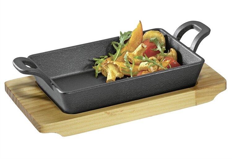 Die stilvolle und nachhaltige Lösung für Ihren nächsten Grillabend. In der BBQ Servierpfanne mit Holzbrett bereiten Sie kleinere Speisen und Beilagen schonend zu. Die Marinade bleibt auf dem Grillgut, nichts tropft in die offene Flamme. Die Pfanne aus wärmespeicherndem Gusseisen hält die Speisen lange warm. Sie ist solide verarbeitet und eine umweltfreundliche Alternative zu Alu-Einwegschalen. Spielt das Wetter nicht mit, kommt die BBQ Servierpfanne auf den Herd. Sie ist geeignet für alle Herdarten und darf natürlich auch in den Backofen. An den stabilen Griffen transportieren Sie die Grillpfanne, das Brett aus Pinienholz ist ideal zum stilvollen Servieren. Clever: Eine Mulde im Brett hält die Pfanne sicher.