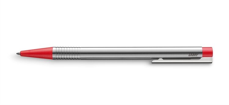 Kugelschreiber aus rostfreiem Edelstahl, rundmattiert. Mit abgefedertem Stahlclip. Druckmechanik mit integrierter Clip-Drücker-Einheit. Mit roten Kunststoffteilen. Mit LAMY Großraummine M 16 rot M.
