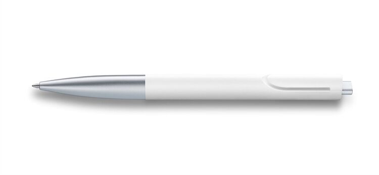 Gehäuse aus besonders schwerem Kunststoff mit mattweißer Oberfläche. Im Kontrast dazu Spitze und Drücker mattsilbern lackiert. Mit Großraummine LAMY M 16 schwarz M.