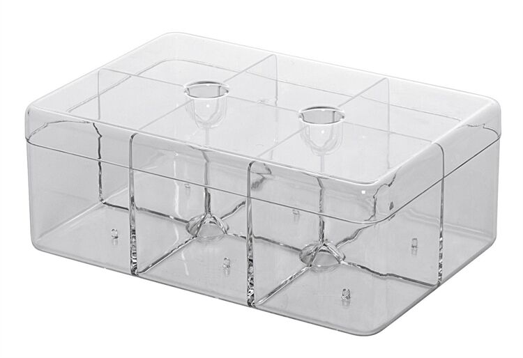 aus Polymethylmethacrylat, durch die praktische Form der Dose, die in 6 Fächer unterteilt ist (jedes bietet für ca. 10 Teebeutel Platz, maximal 60 Teebeutel), kann man selbst den letzten Teebeutel noch mühelos herausnehmen, sSpülmaschienfest