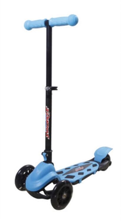 New Sports 3-Wheel Scooter Blau, klappbar, 120mm. ABEC 7 Kugellager. PU Fronträder. Trittbremse. Klappbar. Maße ca. 55x24x66,5cm. Maximale Belastbarkeit 50 kg. Breite des Decks ca. 14cm. Für Kinder ab 3 Jahren.