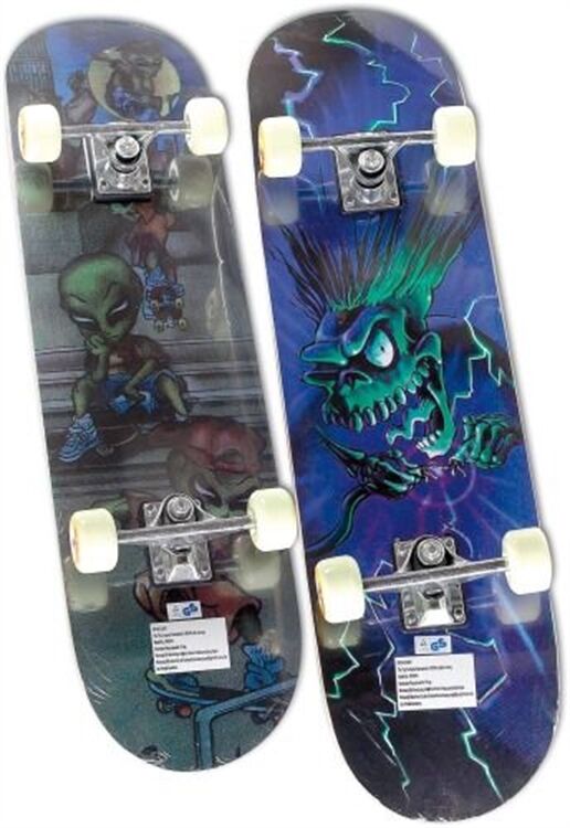 WarnhinweisAchtung! Skateboard gemäß DIN EN 13613:2009, Klasse A für Nutzer bis 100 kg, Sicherheitshinweis: Tragen Sie Schutzausrüstung, Diese besteht aus Handgelenk-, Ellbogen- und Knieschützer sowie einem Helm, Tragen Sie beim Fahren immer Schuhe mit rutschhemmend