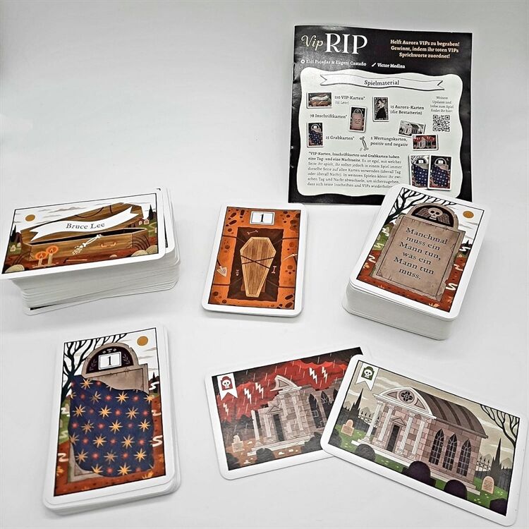 Die poetische Totengräberin Aurora begräbt nur berühmte Persönlichkeiten – und sie braucht für alle den passenden Grabspruch. In Vip RIP helft ihr, die realen oder fiktiven Stars mit Sprichworten zu beschreiben und lasst eure Mitspieler erraten, wen ihr meint! Das Spiel geht über 3 Runden. In jeder Runde übernimmt ein Spieler die Rolle von Aurora, der poetischen Bestatterin. In jeder Runde wählt die Bestatterin 3 ihrer 4 Inschriftkarten und ordnet sie geheim 3 der 9 VIP-Karten auf dem Friedhof zu. Die 3 Inschriftkarten sollten für alle Spieler sichtbar ausliegen. Wenn sie eine Verbindung zwischen einer Inschrift und einem VIP sieht (ob wortwörtlich, metaphorisch oder spirituell …), legt sie die Aurora-Karte mit der Zahl des VIPs auf dem Friedhof unter die entsprechende Inschriftkarte.